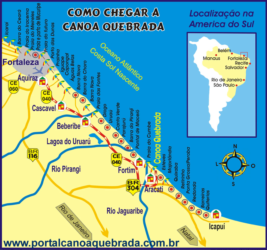 O caminho de cerca de 300 kms a partir de Fortaleza, calcule umas 5 horas de viagem, inclui trechos off road. A parte final destes 300 kms é uma estrada-caminho pela areia, pela beira das praias. Prepare-se.