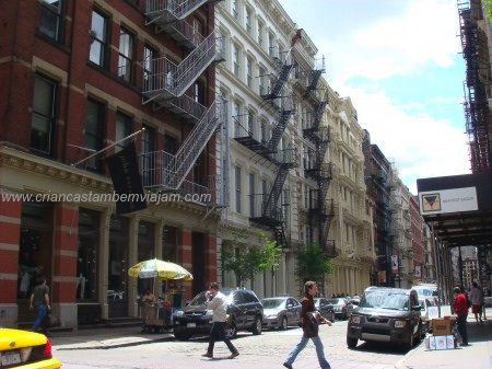 6) Também não ficaria com as crianças em Wall Street, Lower Manhattan e Tribeca. Até mesmo o Soho, que apesar de muito charmoso com seus restaurantes, cafés, lojas e galerias, terá no máximo um playground numa pracinha. Não há muito o que fazer por lá com as crianças e todos os dias será necessário fazer grandes deslocamentos em direção à Times Square, 5a. Av, Central Park, Museu de História Natural… sim, porque com as crianças as áreas mais visitadas serão estas.