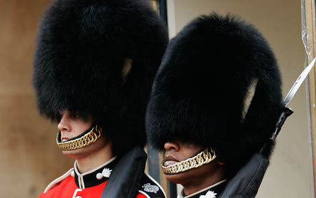 Os “soldadinhos de chumbo”, os Queen’s Guards, que fazem a guarda do palácio passam em desfile acompanhados da banda (Guard Band) que toca músicas diversas – militares e até de filmes. Os soldados desfilam vestidos de uniforme vermelho e aquele chapéu preto que parece esconder os olhos deles, os bearskins caps – feitos de pele de urso negro do Canadá, ai coitados dos ursos…