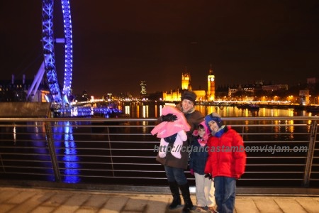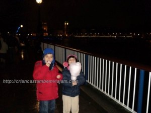 Finalmente chegamos ao Tamisa e o atravessamos em direção à London Eye, a roda-gigante gigante construída para a passagem do milênio. A volta na London Eye não é baratinha, mas é um programa muiiiito legal. Dura cerca de 30 minutos e dá para ver toda a cidade, bem devagarinho. As crianças amaram, não perca.